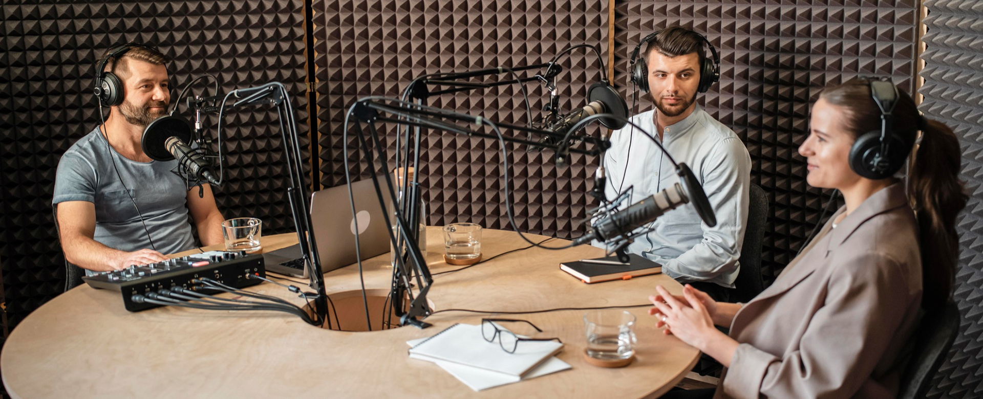Estudio de podcast profesional, equipado con tecnología de alta calidad para la grabación de contenidos, entrevistas y transmisiones en vivo.